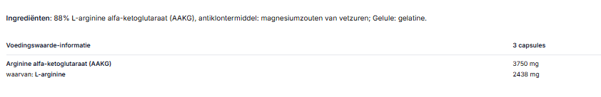 Ingrediënten: 88% arginine alfa-ketoglutaraat (AAKG), vulstof – microkristallijne cellulose; antiklontermiddel – magnesiumzouten van vetzuren; capsule (gelatine, kleur: E 171).