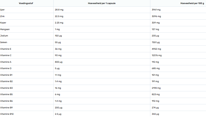 Vit. C (ascorbinezuur), gelatine, vit. E (dl-alfa-tocoferylacetaat), ijzer fumaraat, zink citraat, vit. B3 (nicotinamide), selenium gist, vulstof E460i, mangaan bisglycinaat, vit. H (biotine), vit. B5 (d-calciumpantothenaat), koper bisglycinaat, vit. B6 (pyridoxine hcl), vit. B1 (thiamine hcl), vit. B2 (riboflavine), vit. B12 (cyanocobalamine), glijmiddel E470b, kleurstof E171, vit. A (retinylacetaat), vit. D3 (cholecalciferol), vit. B9 (foliumzuur), kaliumjodide.