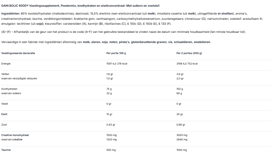 Gain Bolic 6000®, verrijkt met vitaminen en mineralen, vult alle voedingsstoffen aan die essentieel zijn voor de snelle opbouw van spiermassa en -kracht. Bedoeld voor personen met een verhoogde vraag naar energie en eiwitten, die recreatieve sporten beoefenen, maar ook voor sporters die snel spiermassa en -kracht willen opbouwen.