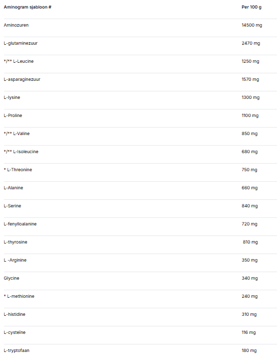 Aanbevolen gebruik: Neem 1-2 porties per dag tussen de maaltijden en/of ongeveer 1 uur voor en/of na de training. Voeg 1 portie (100 g = 2 maatscheppen) toe aan 250 ml water.