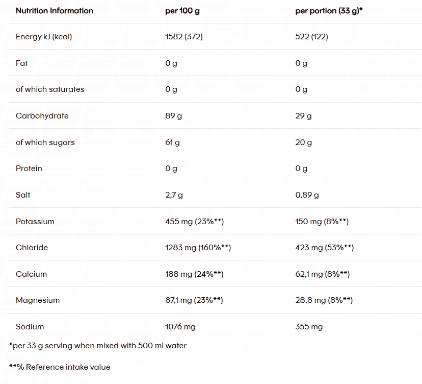 Dextrose, maltodextrine, fructose, mineralen (natriumcitraat, natriumchloride, calciumlactaat, kaliumchloride, magnesiumcarbonaat), zuurteregelaar (citroenzuur), natuurlijke aroma’s, bietensappoeder.