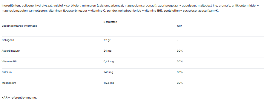 Het product levert collageen-hydrolysaat. De formule bevat ook mineralen, zoals calcium en magnesium, die bijdragen aan het behoud van normale botten en vitaminen, zoals vitamine C, die bijdragen aan de normale collageenvorming voor de normale functie van de botten, het kraakbeen en de huid.