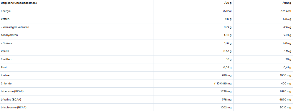 Melkeiwitten [wei-eiwit concentraat (bevat melk), wei-eiwitisolaat (bevat melk)], cacaopoeder (Theobroma cacao) 6%, aroma, verdikkingsmiddelen: E412, E415, inuline, kaliumchloride, zoetstoffen: E955. Bevat van nature aanwezige suikers. Bevat melk.