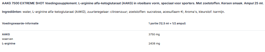 Ingrediënten: water, 30% L-arginine alfa-ketoglutaraat (AAKG), zuurteregelaar – citroenzuur, zoetstoffen – sucralose, acesulfaam K; conserveringsmiddelen – E202, E211, aroma’s, kleurstoffen: gemengde carotenen, karmijn (voor kersen, grapefruit smaken).