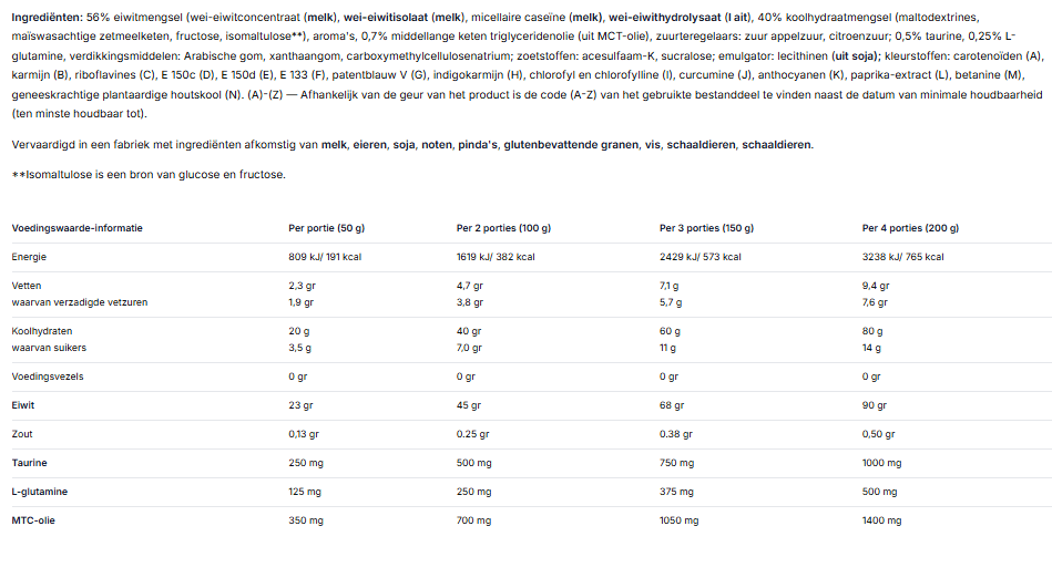Ingrediënten: 56% eiwit-mix (wei-eiwitconcentraat (uit melk), wei-eiwit-isolaat (uit melk), micellaire caseïne (uit melk), wei-eiwithydrolysaat (uit melk)), 40% koolhydraten-mix (maltodextrines, hoogmoleculaire lange-keten wasachtig maïszetmeel, fructose, isomaltulose*), aroma’s, 0,7% middellange-keten triglyceriden olie (MCT-olie), zuurteregelaars – appelzuur, citroenzuur (voor alle aardbeienachtige smaken); 0,5% taurine, 0,25% L-glutamine, verdikkingsmiddelen – Arabische gom, xanthaangom, natriumcarboxy methylcellulose; zoetstoffen – acesulfaam K, sucralose, cyclamaten; 0,02% vitaminen (L-ascorbinezuur – vit. C, DL-alfa-tocoferylacetaat – vit. E, nicotinamide – niacine, D-biotine, retinylacetaat – vit. A, calcium D-pantothenaat – pantotheenzuur, pyridoxinehydrochloride – vit. B6, cholecalciferol – vit. D, pteroylmonoglutaminezuur – folaat, thiaminemononitraat – vit. B1, riboflavine – vit. B2, cyanocobalamine – vit. B12), emulgator – sojalecithine; kleuren: karmijn (voor iedereen: aardbei, kers, aardbeien-kiwi en banaan-kersenachtige smaken), E 150c (voor iedereen: koekjesroom, toffee, chocolade, koffie, ijskoffie, hazelnoot, cappuccino en tiramisu-achtige smaken), riboflavine, E 133 (voor alle pistacheachtige smaken).