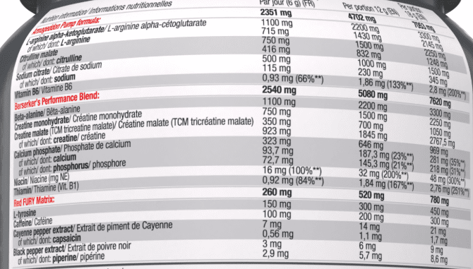 Ingrediënten: beta-alanine, L-arginine alfa-ketoglutaraat, citrulinemalaat, creatinemonohydraat, aroma’s, natriumcitraat, calciumfosfaat, creatinemalaat, antiklontermiddel – siliciumdioxide; L-tyrosine, zuurteregelaars – citroenzuur, appelzuur; cafeïne, zoetstoffen – acesulfam K, sucralose, cyclamaten; nicotinamide – niacine, Cayennepeper-extract (Capsicum annuum L.) ), zwarte peper extract (Piper nigrum L. ), verdikkingsmiddelen – natriumcarboxymethylcellulose, xanthaangom, acaciagom; pyridoxinehydrochloride – vit. B6, thiaminehydrochloride – vit. B1, kleuren: karmijn (voor RED PUNCH smaak), bèta-caroteen, karmijn, riboflavine (voor ORANGE JUICE smaak), riboflavine (voor CITRON POWER smaak en LIME CRIME MINT smaak), briljant blauw FCF (voor BLUEBERRY MADNESS smaak en REFRESHING BERRY smaak), riboflavine, briljant blauw FCF (voor GREEN APPLE BLAST smaak), E 150d (voor RAGING COLA smaak).
