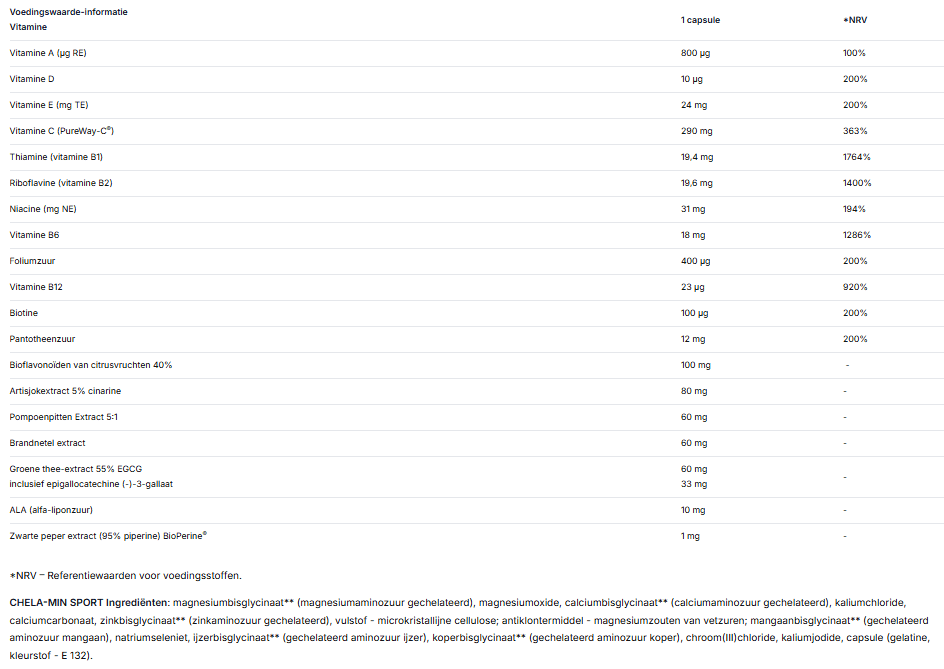 Ingrediënten: vitaminen (micro-ingekapseld L-ascorbinezuur (Pureway-C®) – vit. C, dl-alfa-tocoferylacetaat – vit. E, nicotinamide – niacine, D-biotine, retinylacetaat – vit. A, calcium D-pantothenaat – pantotheenzuur, pyridoxinehydrochloride – vit. B6, cholecalciferol – vit. D, pteroylmonoglutaminezuur – foliumzuur, thiaminemonononitraat – vit. B1, riboflavine – vit. B2, cyanocobalamine – vit. B12), citrusbioflavonoïden, artisjokextract, pompoenzaadextract, brandnetelextract, groenethee-extract, alfa-liponzuur, zwartepaprika-extract, vulstof – microkristallijne cellulose, antiklontermiddel – magnesiumstearaat, capsule (gelatine, kleuren: E 171).