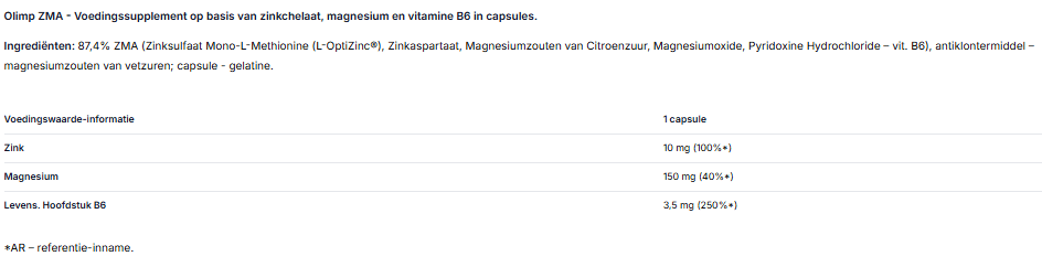 Ingrediënten: 99,2% ZMA® (zinkmono-L-methioninesulfaat (L-OptiZink®), zinkaspartaat, magnesiumcitraat, magnesiumoxide, pyridoxinehydrochloride – vit. B6), antiklontermiddel – magnesiumstearaat, capsule (gelatine, kleur: E 171).